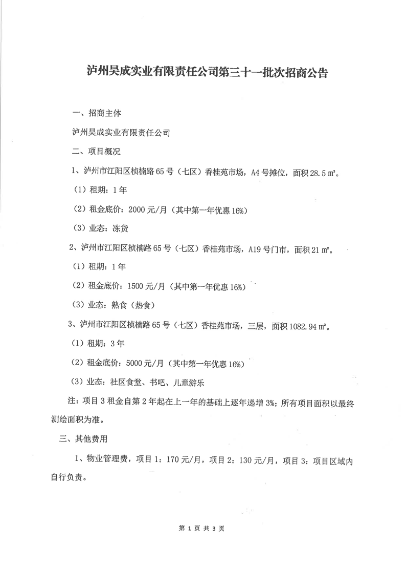 泸州昊成实业有限责任公司第三十一批次招商公告