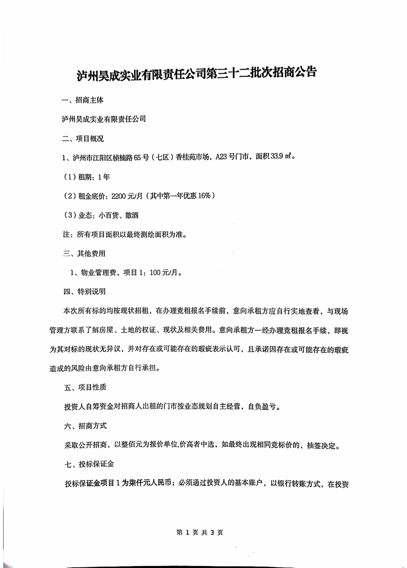泸州昊成实业有限责任公司第三十二批次招商公告