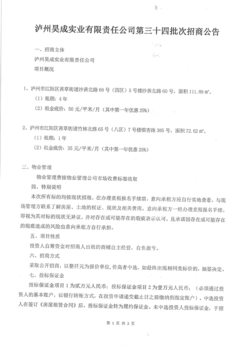 泸州昊成实业有限责任公司第三十四批次招商公告